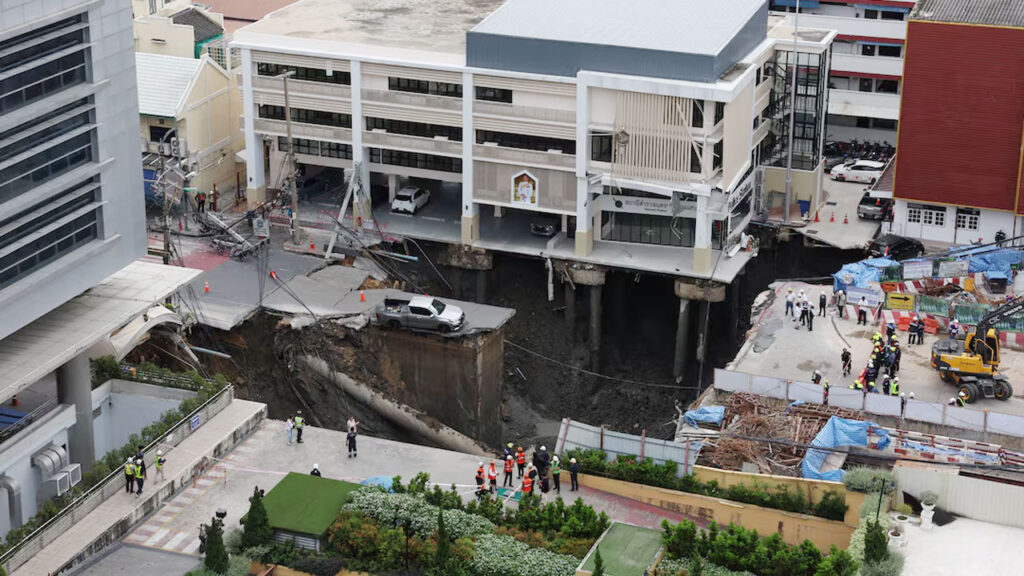 থাইল্যান্ডের রাজধানী ব্যাংককে সামসেন রোডের একটি অংশ দেবে গেছে। এতে করে ভাজ...